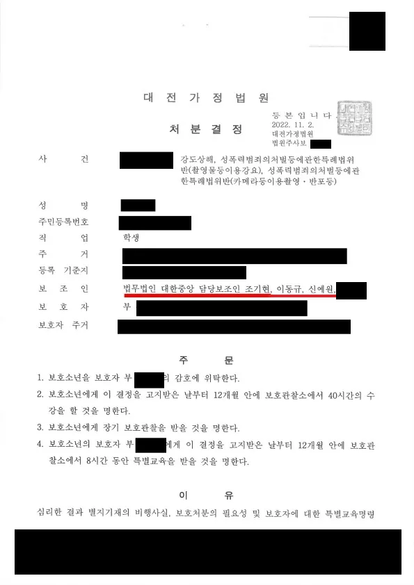 법무법인 대한중앙의 조력으로 소년은 1, 2, 5호 처분결정을 받았습니다이는 이 사건 소년에게 정말 정말 내려지기 어려운 가벼운 처분이었습니다.